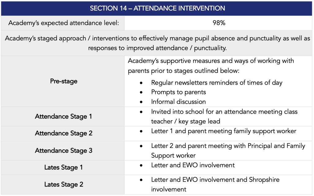 Whilst we recognise that children can get ill from time to time, our attendance expectation for all pupils is 98%. When pupils fall below this expectation, the academy will consider the support in place to help you raise your child’s attendance. Should your child’s attendance fall below 90% they will be classed as persistent absentee. It is at this point which we will invite parents into school to discuss our concerns and agree an action plan to improve attendance. We may share our concerns with the Education Welfare Officer.